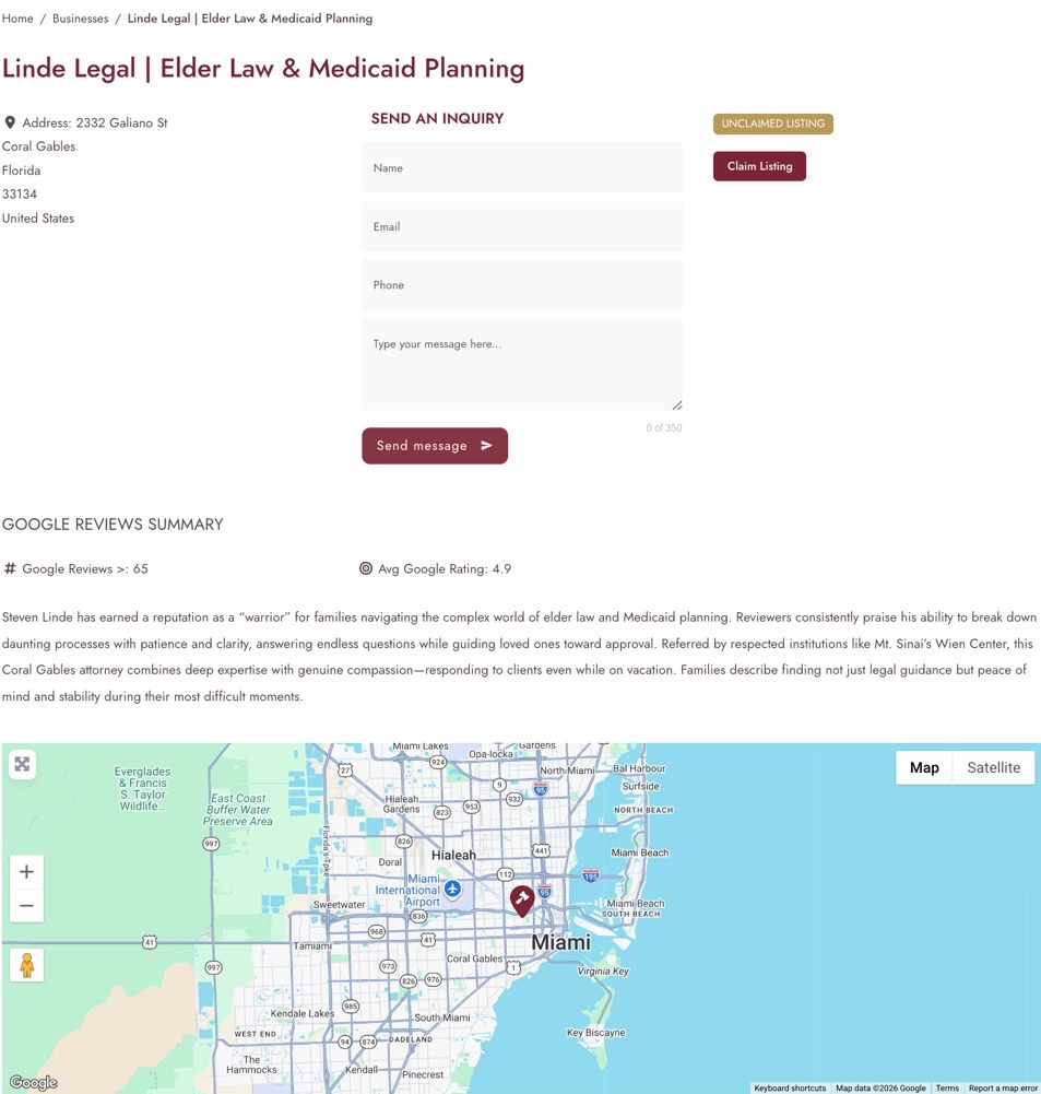 An unclaimed listing shows your basic details and a generic contact form. No description. No services. All inquiries are routed through us.